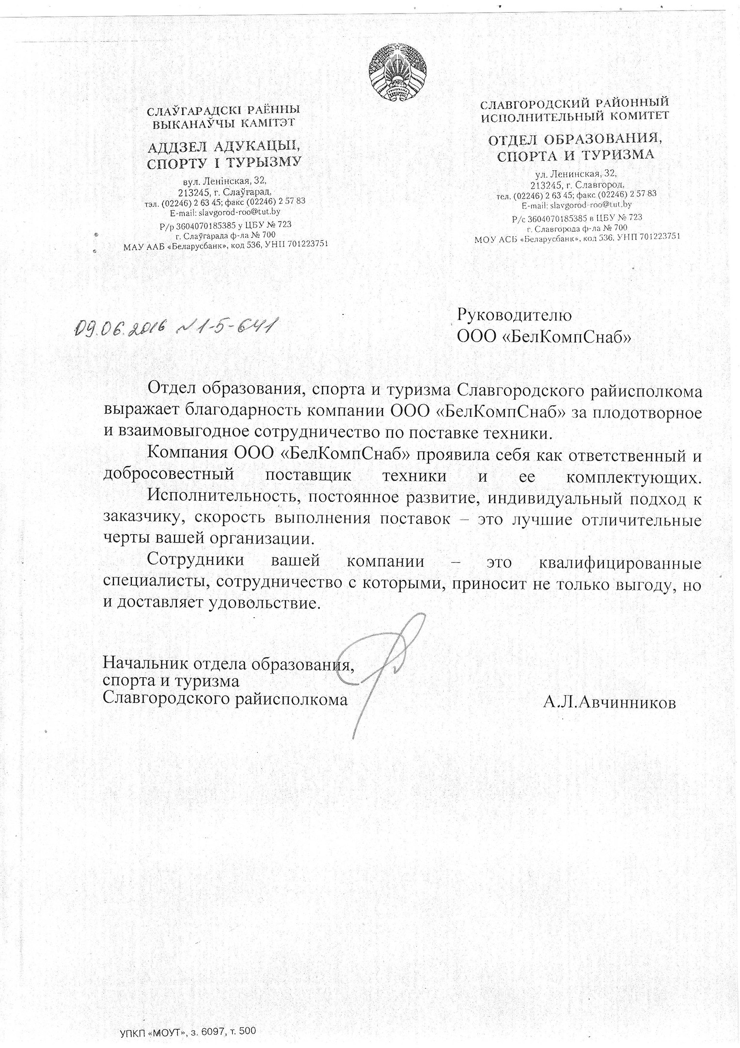 Отдел образования, спорта и туризма Славгородского райисполкома выражает благодарность компании ООО «БелКомпСнаб» за плодотворное и взаимовыгодное сотрудничество по поставке техники.