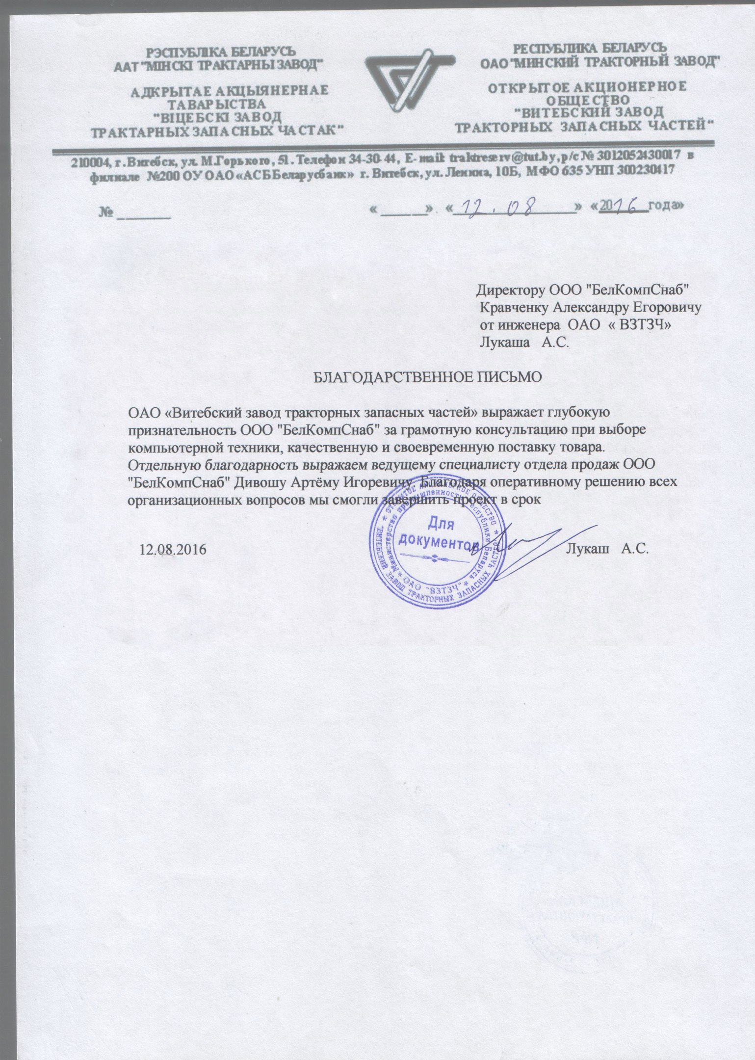ОАО «Витебский тракторный завод запасных частей» выражает глубокую признательность ОАО «БелКомпСнаб» за грамотную консультацию при выборе компьютерной техники, качественную и своевременную поставку товара. Отдельную благодарность выражаем ведущему специалисту отдела продаж ООО «БелКомпСнаб» Дивошу Артему Игоревичу. Благодаря оперативному решению всех организационных вопросов мы смогли завершить проект в срок.